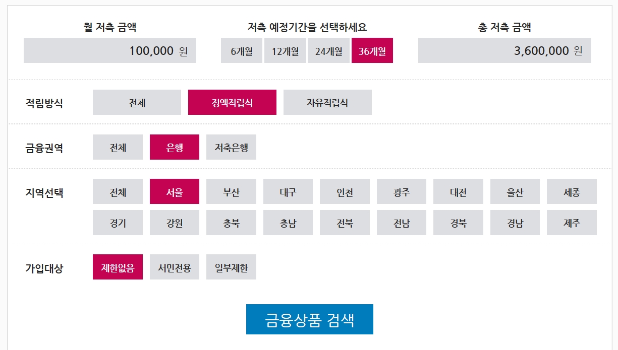 사이트 상단에서 적금 항목을 선택하고, 저축 금액 등 세부 항목을 선택 합니다.