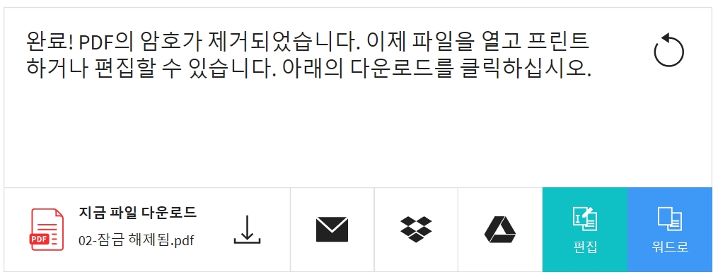 PDF 잠금해제 가 완료되었습니다. 지금까지 PDF 잠금해제 하는 방법에 대해 알아보았습니다. 해당 사이트는 처음 2번은 무료이고 그 다음부터는 30분을 기다려야 한 번 사용이 가능합니다. PDF 편집을 자주하면 유료 버전을 사용해도 좋겠지만 자주 이용하는게 아니라면 무료 버전도 충분히 유용합니다.