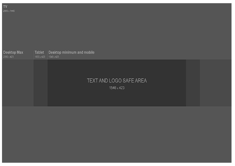 규정 사이즈는 위와 같습니다. TV -> 2560x1440 / 데스트탑 최대 2560x423 / 태블릿 1655x423 / 데크스탑 최소&모바일 1546x423 그리고 데스크탑 최소&모바일 영역이 기기와 상관없이 텍스트와 로고가 잘리지 않는 영역입니다.