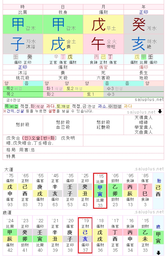 그러면 이렇게 만세력을 볼 수 있습니다. 한자로 써있고 뭘뭘 말말하는지 전혀 모르겠지만 이걸 해석 할 수 있다면 아주 유용하게 사용할 수 있을 것 같습니다.