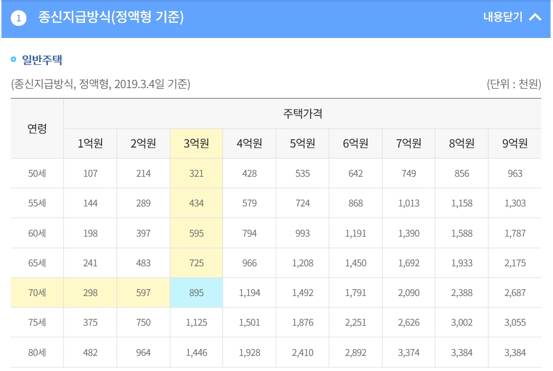 종신지급방식(정액형 기준) 예상 수령액입니다. 70세(부부 중 연소자 기준), 3억원 주택 기준으로 매월 89만 5천원을 수령합니다.