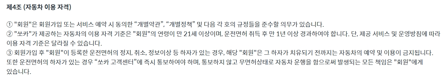 쏘카의 나이제한은 약관에서 찾아볼 수 있는데요, 연령 만 21세 이상이며, 운전면허 취득 후 만 1년 이상 경과해야 이용이 가능합니다.