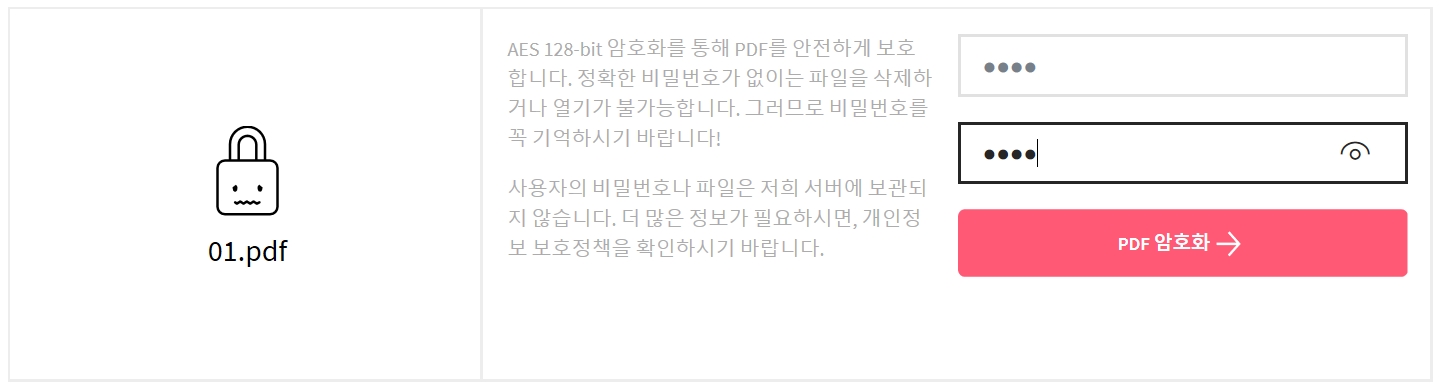 원하는 비밀번호를 두 번 입력하고 PDF 암호화 버튼을 클릭합니다.