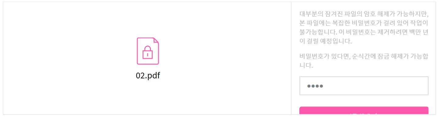 테스트 해본 파일은 아무 의미도 없는 파일이라 비밀번호를 아주 간단한 숫자 네자리로 만들었는데도 복잡해서 풀 수 없다고 뜹니다. 그래서 이 방법은 비밀번호를 알고 있어야 가능합니다. 비밀번호를 입력하고 버튼을 클릭합니다.