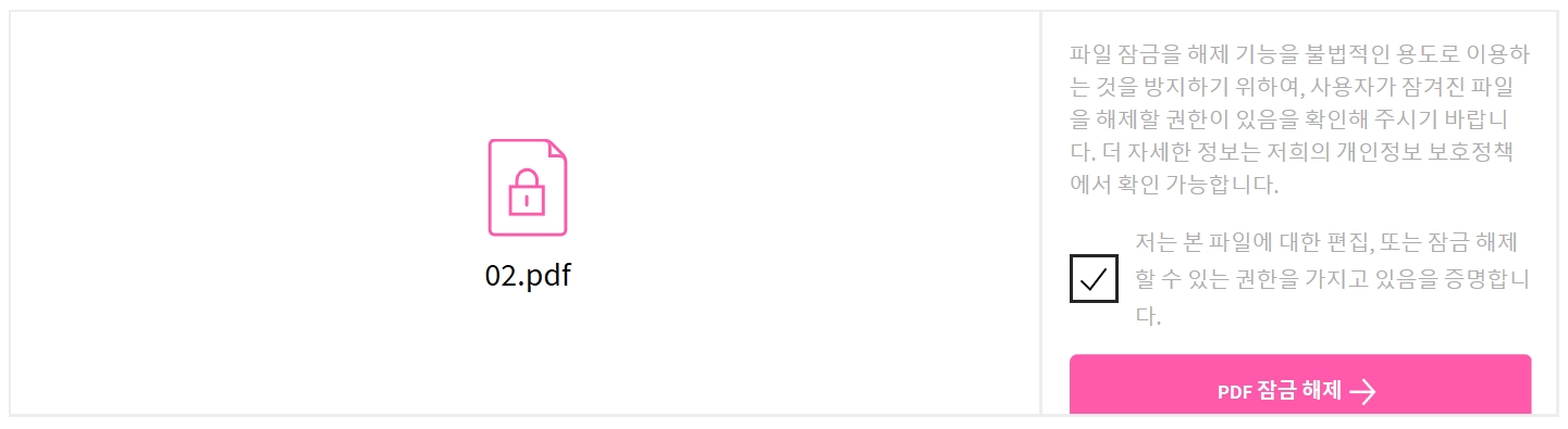 권한을 가지고 있다는 체크박스에 체크를 하고 PDF 잠금 해제 버튼을 클릭합니다.