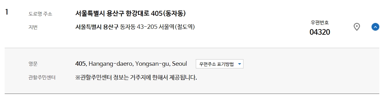 아래처럼 이미지처럼 우편번호 옆에 작은 파란 동그라미를 누르면 정확한 영문 주소가 나옵니다. 간단하게 영문 주소를 확인할 수 있습니다.