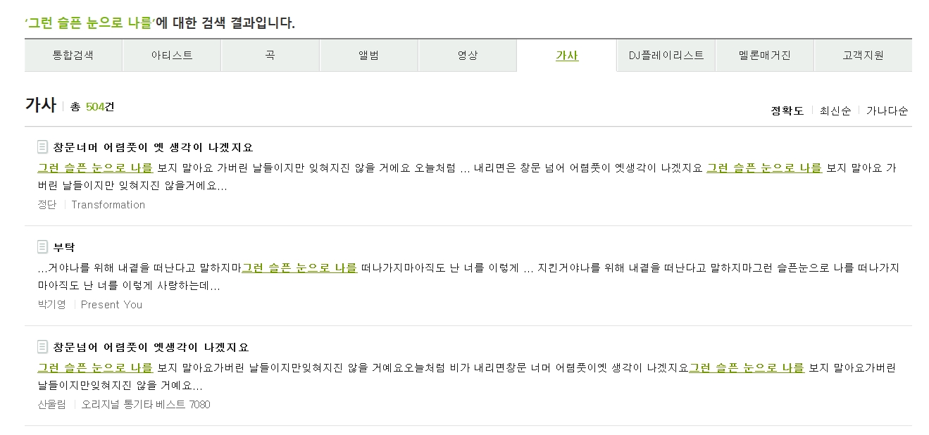 노래 가사는 뜨문 뜨문 생각이 나는데 제목이나 가수 이름은 도무지 생각이 안날때가 있습니다. 그럴때 기억나는 가사로 노래를 찾는 방법입니다.