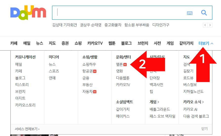 다음 메인에서 아래 이미지에 적힌 순서대로 더보기>멜론 으로 들어갑니다.
