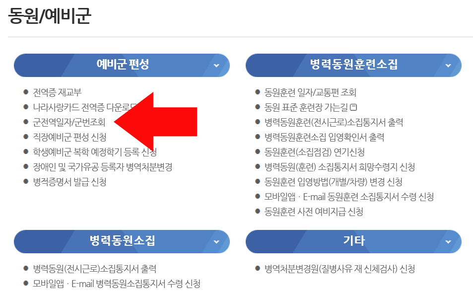 아래 이미지 화살표시 된 군전역일자/군번조회 항목을 클릭합니다.