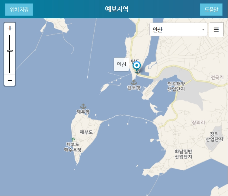 이용 방법은 간단합니다. 사이트로 들어가 지도 옆에 검색어 입력란에 제부도를 입력하면 제부도와 가까운 지역이 뜨는데요, 여기서 안산을 선택합니다.