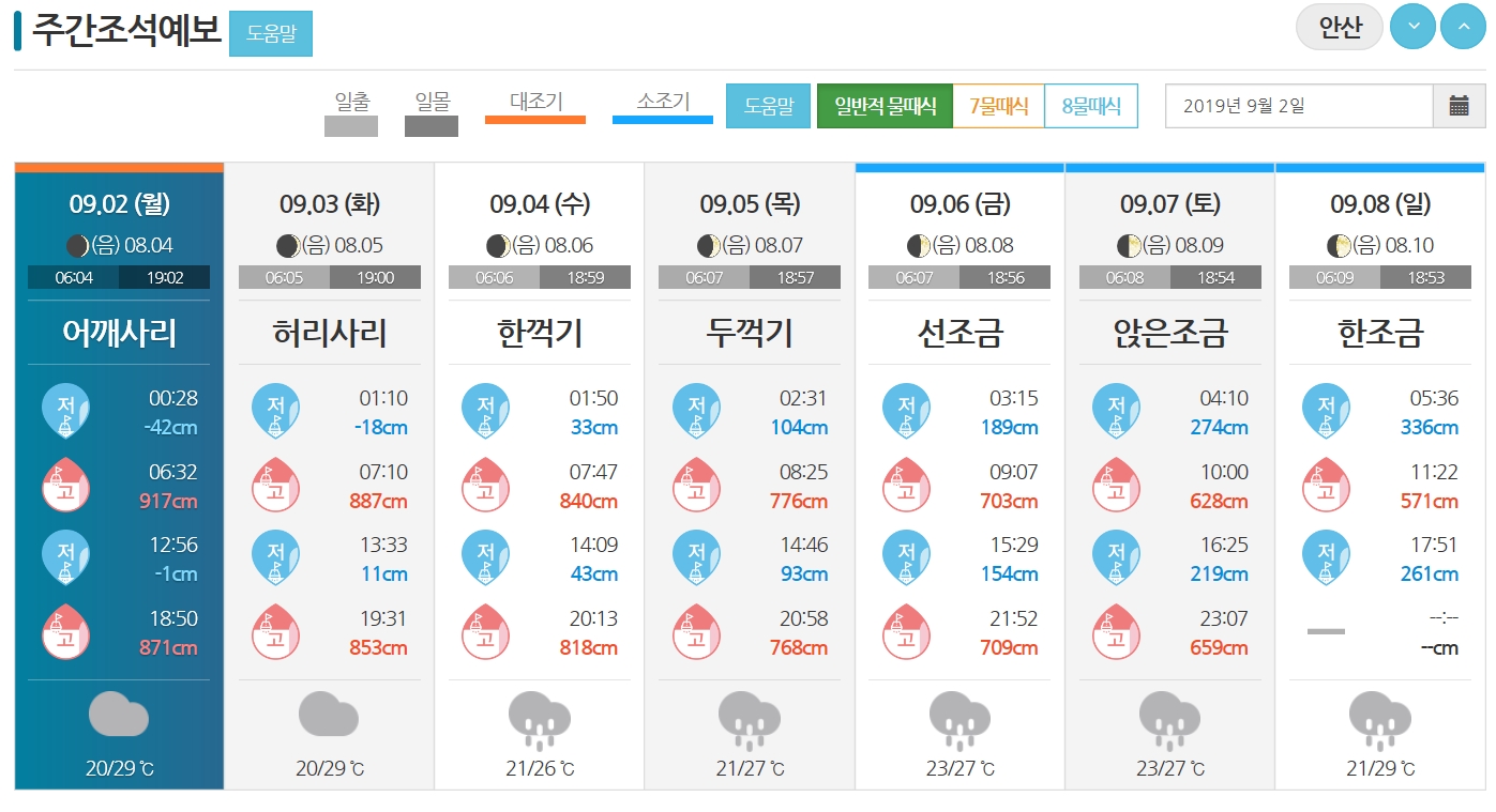 그럼 이렇게 제부도와 가까운 안산 탄도항의 물때표를 볼 수 있습니다.