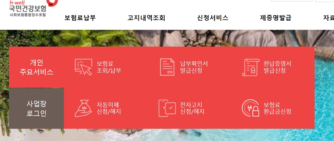 h-well 국민건강보험 사회보험통합징수포털 - 메인 화면