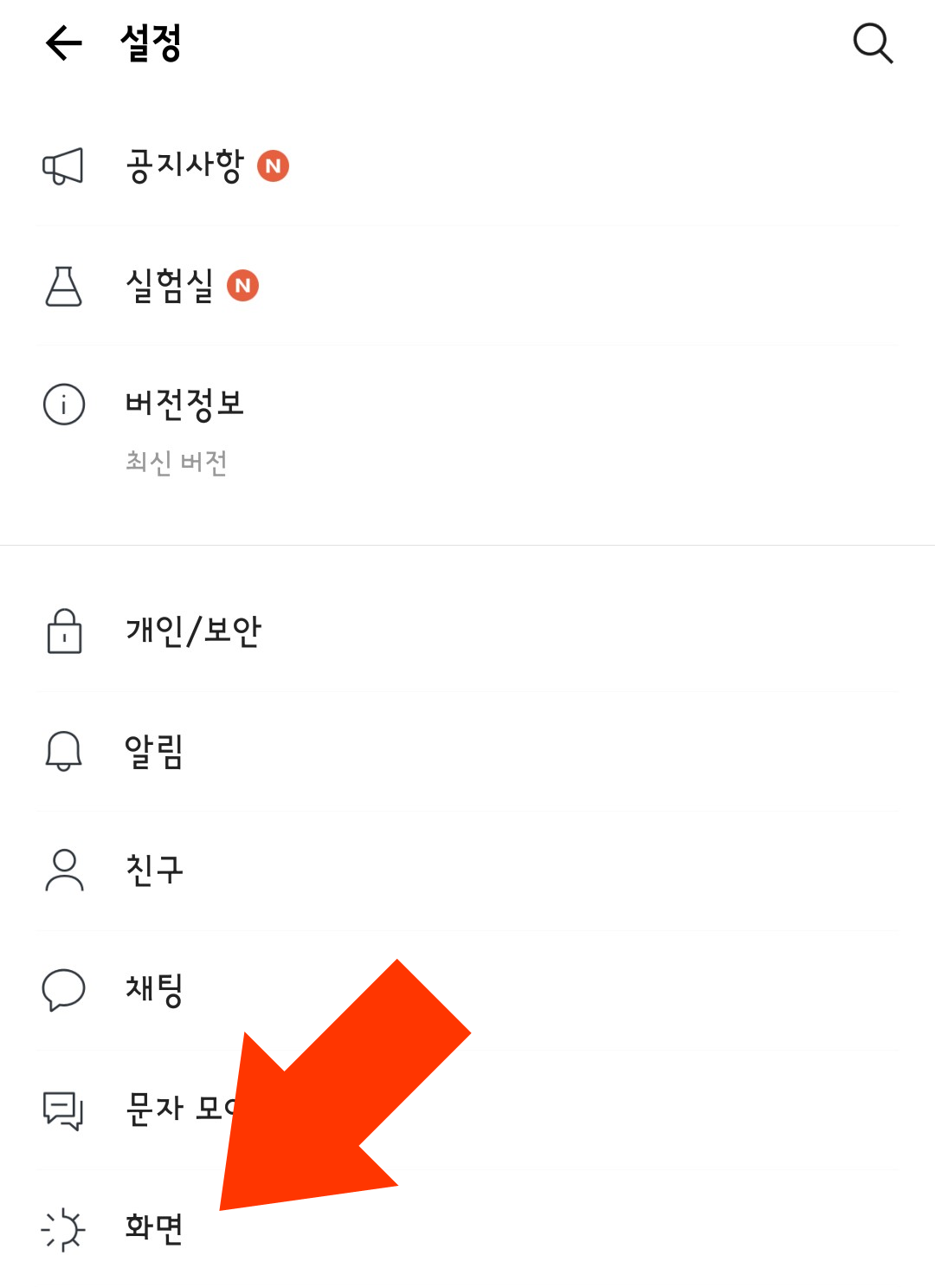 그럼 설정 화면이 보이는데요, 여러가지 설정 항목들 중 화면 항목을 선택합니다.