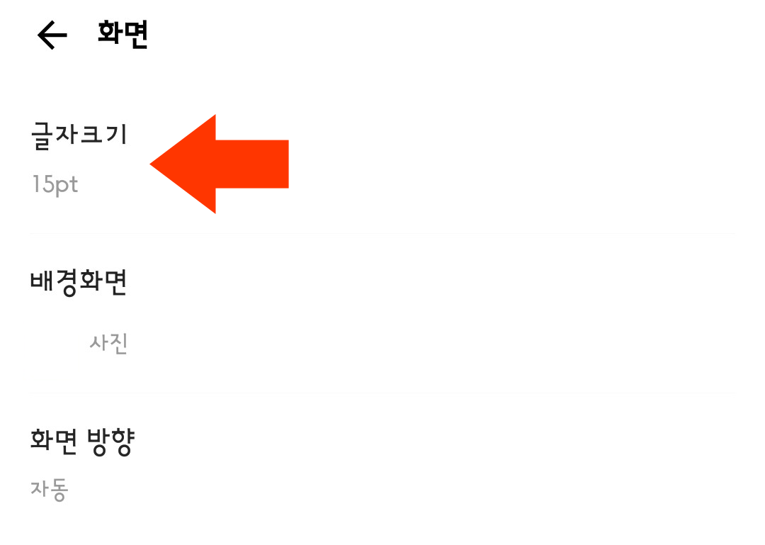 화면으로 들어가면 첫번째에 글자크기 라는 항목이 있습니다. 글자크기 항목을 선택합니다.