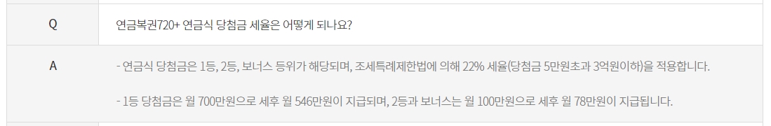 연금복권 1등에 당첨되면 매달 700만원씩 20년간 지급받게 되는데요, 연금복권의 세율은 22%입니다.