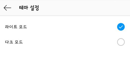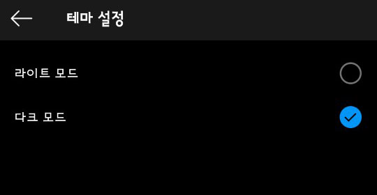 테마설정으로 들어가면 라이트 모드에 체크가 되어 있습니다. 다크 모드 옆 동그라미를 선택해 다크 모르로 바꿔줍니다.