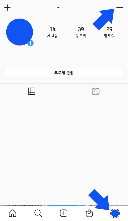 먼저 인스타그램 앱을 열고 제일 아래 오른쪽 본인의 프로필 이미지를 눌러 내 계정 편집 화면으로 들어갑니다. 내 계정 편집 화면에서 상단 三 모양의 아이콘을 선택하면 설정 창이 열립니다.