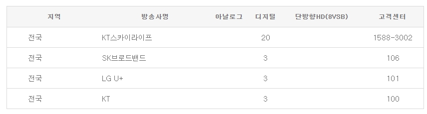 먼저 가장 많이 사용하는 전국 방송사별 채널번호입니다. KT스카이라프는 20번이고 SK브로드밴드, LG U+,KT 는 모두 3번입니다.