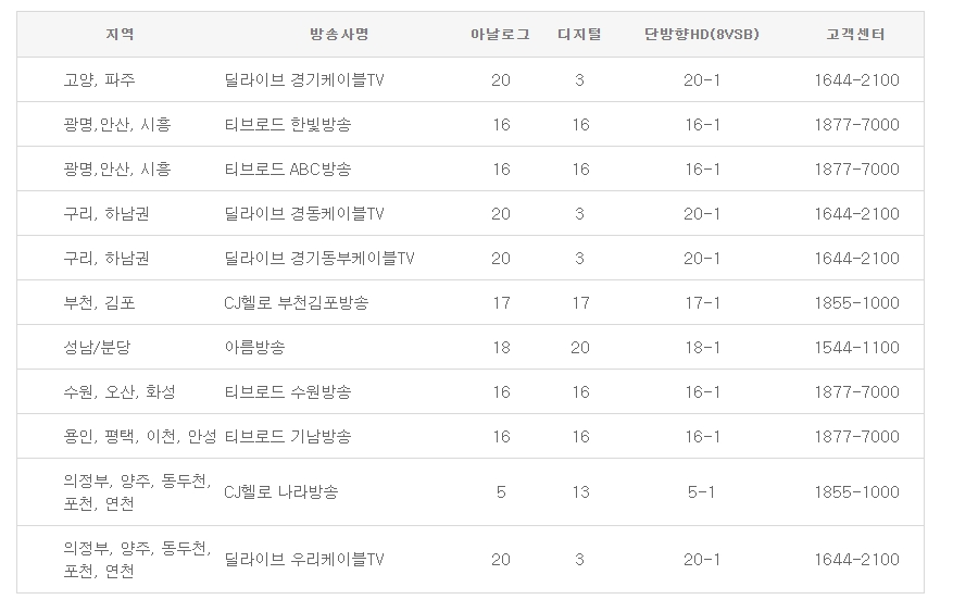 이외에 다른 지역 채널번호는 아래 tvN 홈페이지 채널번호 안내를 보면 알 수 있습니다.