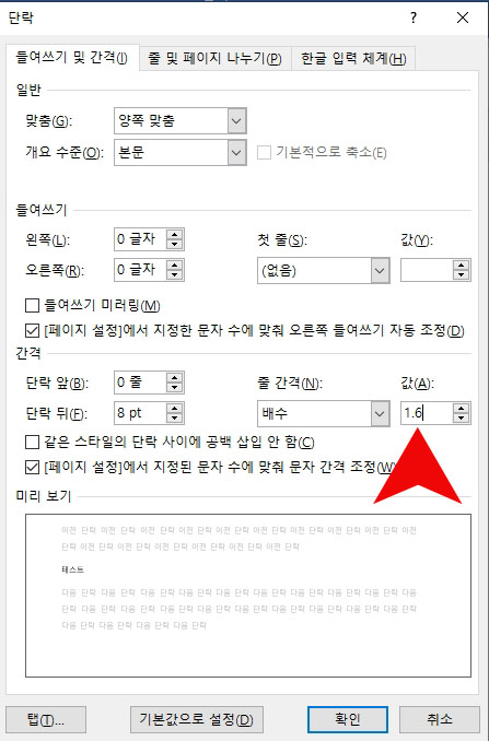 단락 설정 팝업이 뜹니다. 만약 줄간격을 160으로 설정하고 싶다면 여기에서 줄 간격 값을 1.6으로 설정합니다.