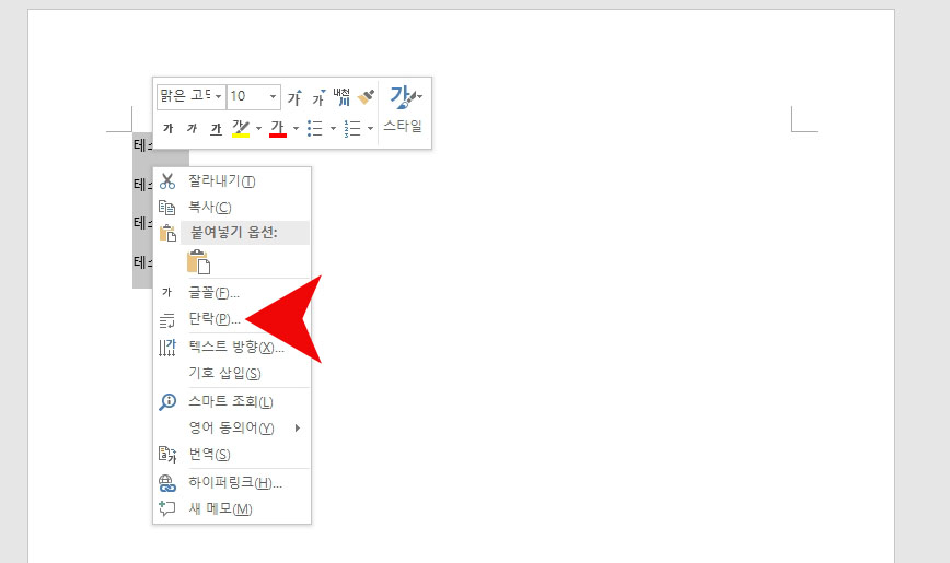 선택한 범위 위에 마우스를 올리고 오른쪽 버튼을 클릭합니다. 여러 항목들 중 단락을 선택합니다.