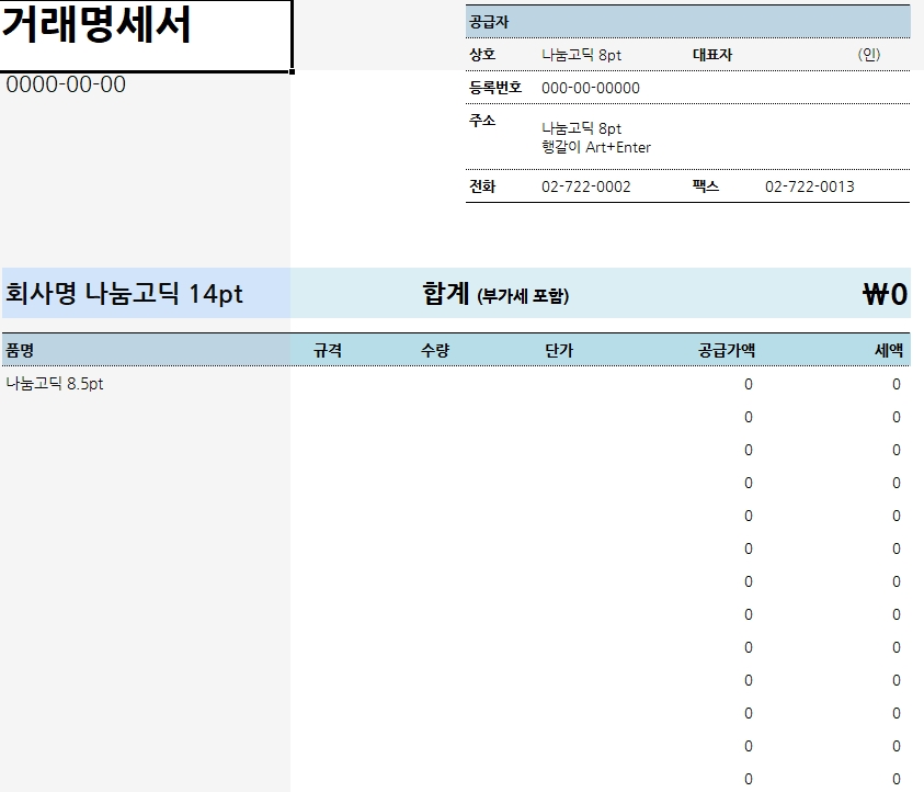 거래명세서 양식을 다운로드 받아서 열어보았습니다. 상호나 날짜, 품목 등을 직접 입력할 수 있습니다. 네이버에서 배포하는 문서 서식이라 기본 글꼴은 나눔고딕입니다.