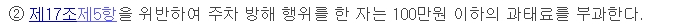 위와 같은 주차 방해 행위를 할 경우 100만원 이하의 과태료가 부과됩니다. 의외로 장애인전용주차구역에 주차 위반 한 것보다 주차 방해을 했을 때 벌금이 훨씬 더 큽니다.
