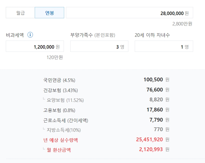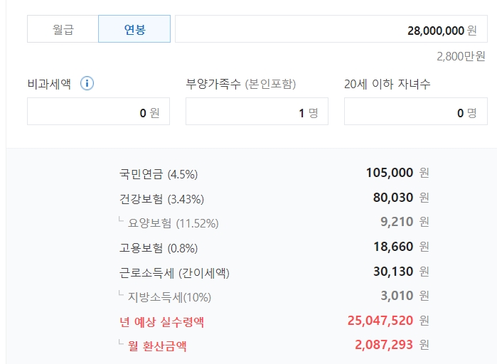 연봉이 2800만원이고 비과세항목, 부양가족이 없는 경우 실수령액 계산기로 계산해보니 실수령액은 약 208만원 정도입니다.