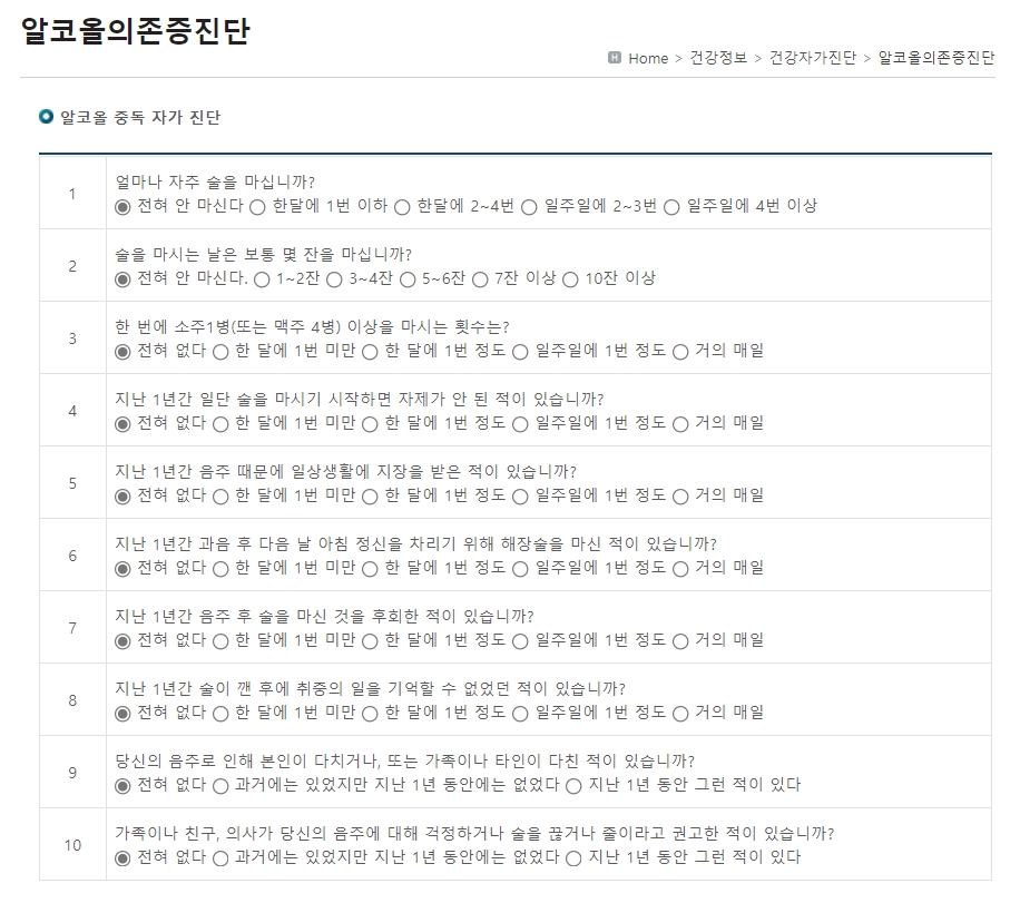 아래 링크를 클릭하면 알코올 의존증 자가진단 화면으로 이동합니다.