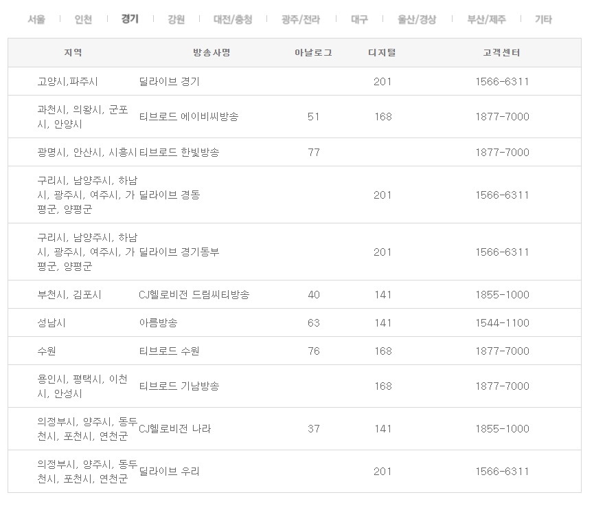 경기 채널번호는 딜라이브가 201번, 티브로드가 168번, CJ헬로비전인 141번 입니다.
