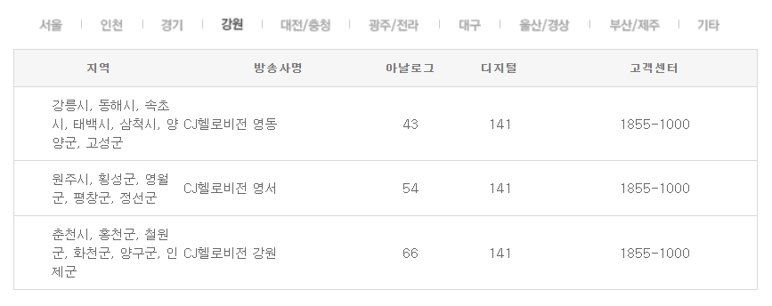 강원 지역의 투니버스 채널번호입니다. 강원지역은 CJ헬로비전이 141번입니다.