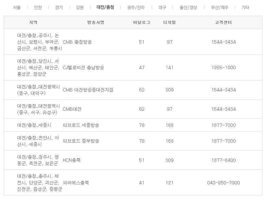 지역별/방송사별 채널번호입니다. 채널번호는 시기마다 변경되기도 하니 혹시라도 채널 번호가 안맞는다면 채널 번호가 변경 된 것일 수도 있습니다. 정확한 채널번호를 확인하고 싶다면 아래 링크에 투니버스 홈페이지 채널번호를 확인해보세요.